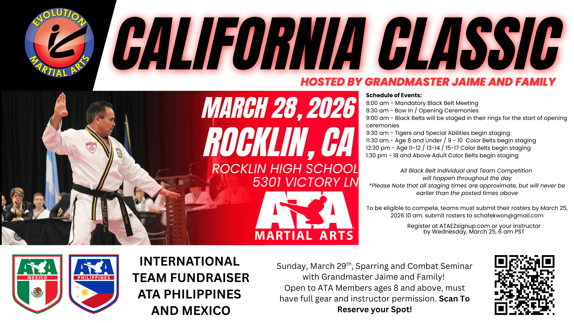 Join us on Sunday, March 19th for a Sparring / Combat Weapons Sparring Seminar! This event is a fundraiser for TEAM ATA Philippines and Mexico to attend the Songahm Cup (Worlds 2026); ALL ATA Members ages 8 and older are invited to attend