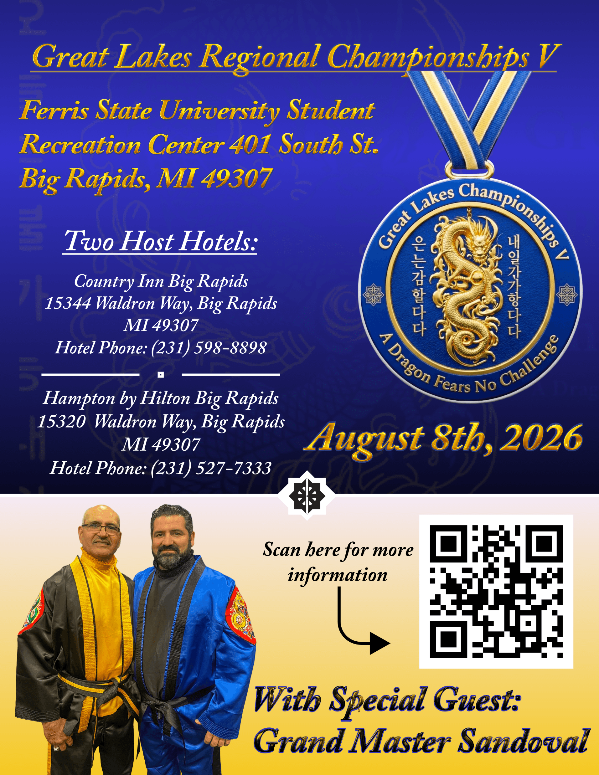 Host Hotel #2: Hampton by Hilton Big Rapids, 15320 Waldron Way, Big Rapids (phone #) 231-527-7333.